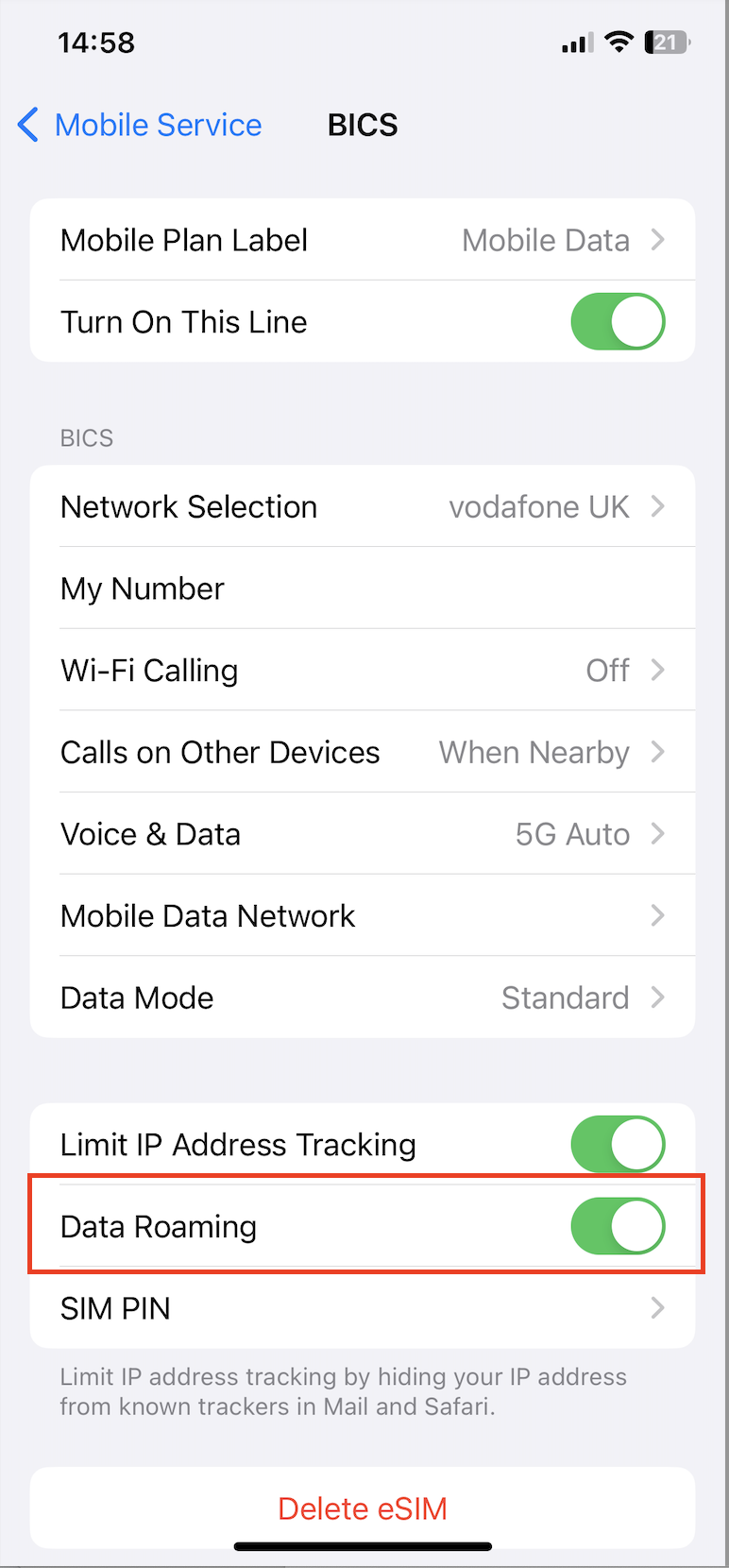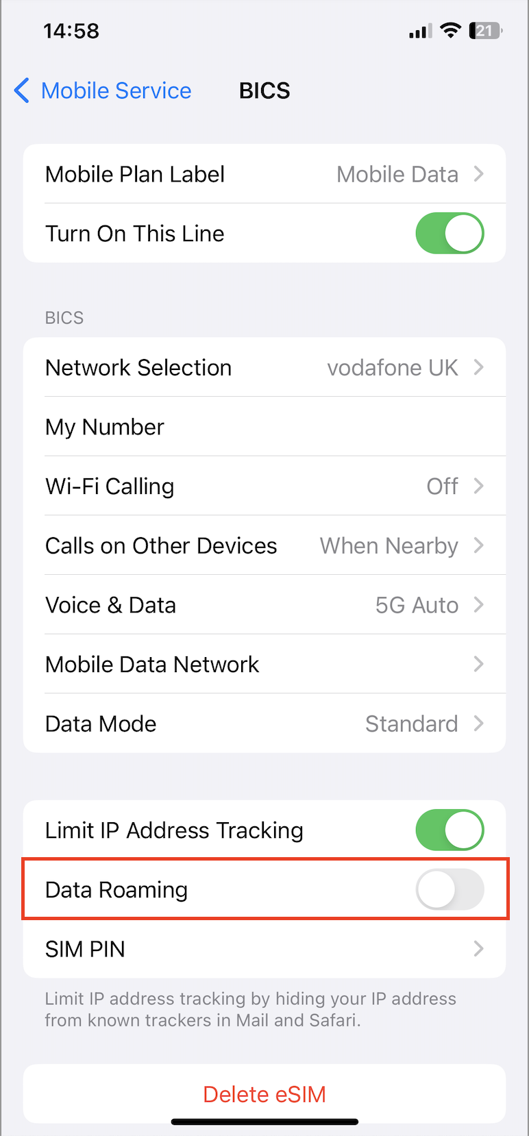 12. The Data Roaming toggle should appear as below on the installed eSIM.